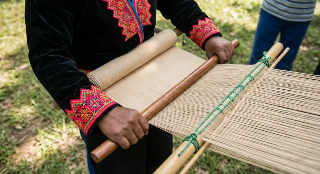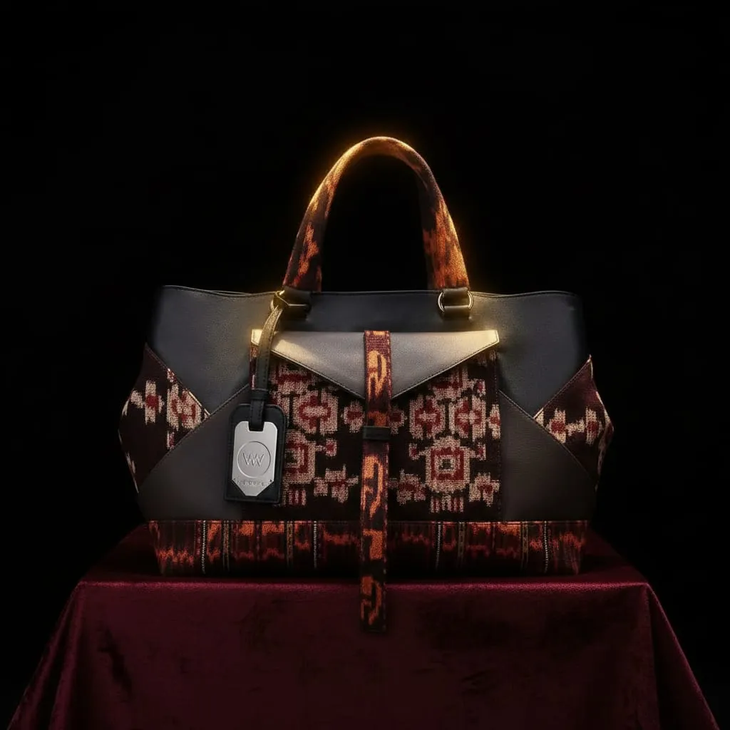 Artisan ahli menyatukan dua material berharga—tenun warisan dan kulit premium—di bawah arahan artistik standar fashion house.