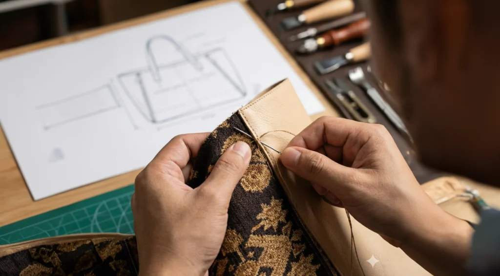 "Setiap tas dikerjakan oleh artisan ahli yang mengolah kulit dan wastra dengan presisi, di bawah arahan desainer layaknya luxury fashion house — bukan pabrik industri."
